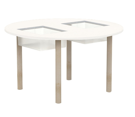 Mesa con cubetas. Cuenta en su parte superior con dos cubetas, diseñada para que los niños jueguen, experimenten e interactuen. Posibilidad de escoger otros colores para las cubetas. Patas de madera de haya de Ø50 mm. con acabado en barniz al agua, ecológico y no tóxico, ensambladas mediante sistema de roscado sobre base metálica. Radio de curvatura 6 mm. en las partes susceptibles de choque por seguridad. Dimensiones: · Diámetro de 110 cm. · Altura: Talla 1, 46 cm. El mobiliario se pide por encargo y no es susceptible de devolución. Para casos excepcionales consultar condiciones. Mesa sens. cubetas Ø110 cm T1 patas Madera/Blanco
