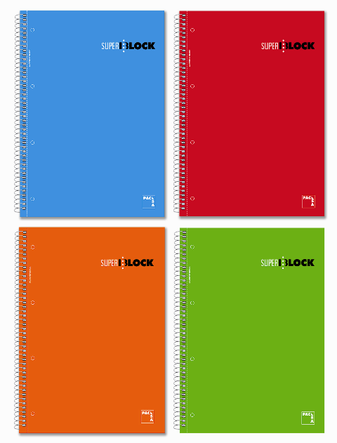 Cuaderno espiral con tapa contracolada microperforado en A5 y A4, 160 hojas offset blanco de 60 gr. rayado con greca, cuatro taladros. Cinco colores de tapas.